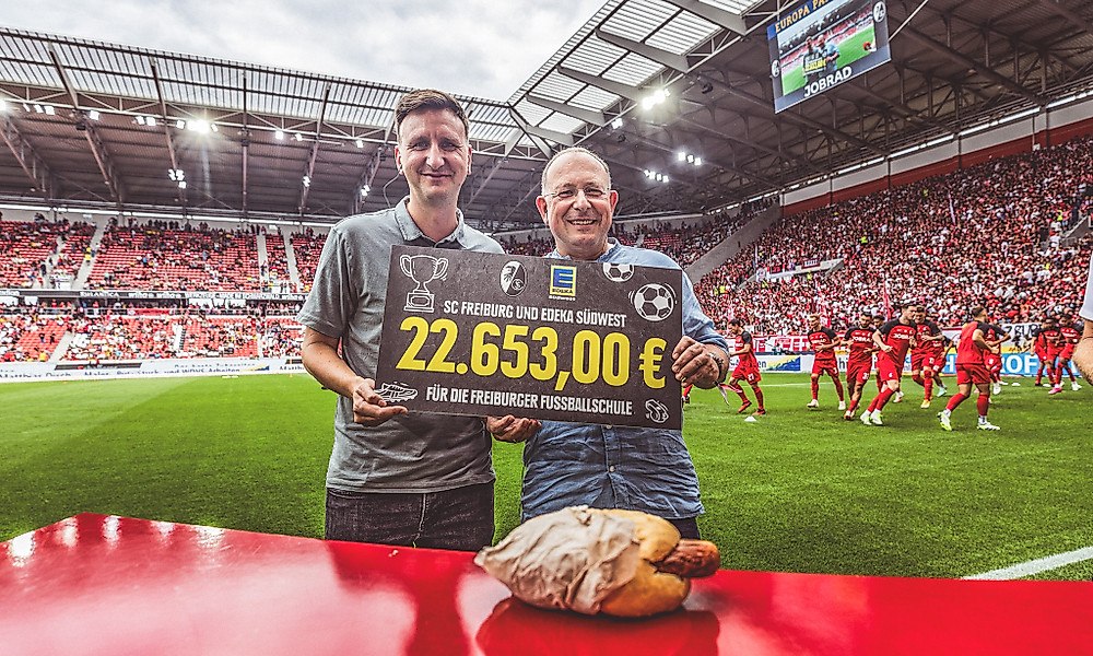Vor dem Heimspiel gegen Borussia Dortmund überreichte Rainer Huber, Sprecher des Vorstandes bei EDEKA Südwest, einen Scheck über 22.653 Euro an die Freiburger Fußballschule, den Andreas Steiert, Leiter der Fußballschule, lächelnd entgegennahm. "Das Geld kommt unserer Jugendarbeit zu Gute. Wir freuen uns sehr. Schön, dass es so eine tolle Aktion gibt", betonte Steiert.