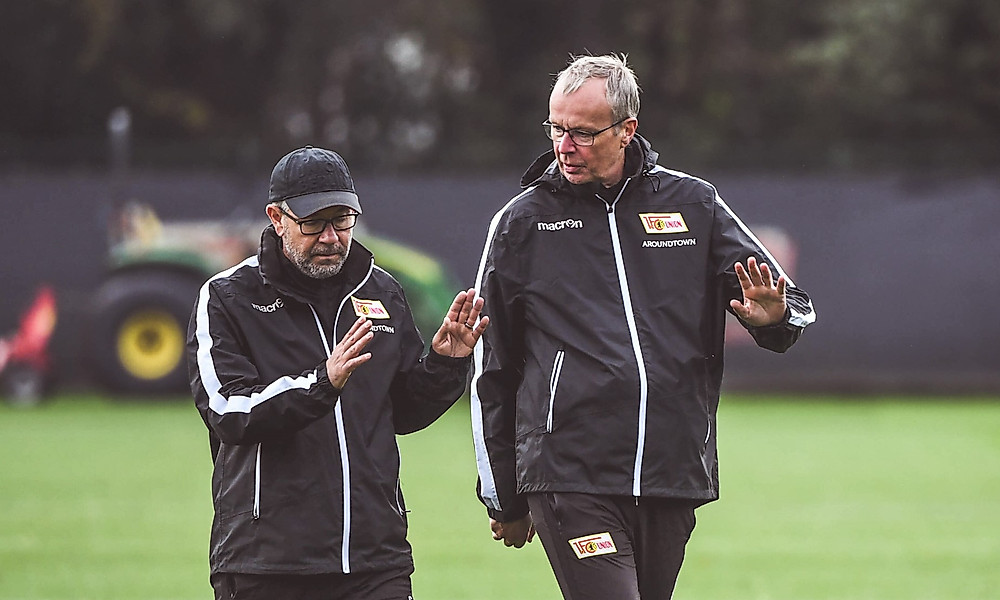 Das Foto von Urs Fischer und mir ist 2019 bei einer für Kiebitze offenen Trainingseinheit von Union Berlin entstanden. Viele dachten damals, ich wäre der neue Mannschaftsarzt. Tatsächlich habe ich die Mannschaft von Union in ihrer ersten Bundesligasaison 2019/2020 hinweg eng begleitet, um ein Buch darüber zu schreiben (Christoph Biermann: Wir werden ewig leben, Mein unglaubliches Jahr mit dem 1. FC Union Berlin; d.Red.) Daher war ich in Mannschaftsbesprechungen dabei, in Trainingslagern, auf Auswärtsreisen und eben auch auf dem Trainingsplatz. Und immer, wenn ich dabei war, musste ich dann wie auch auf dem Foto die sogenannte „Rudelkleidung“ tragen. Was total gut war, du gehörst einfach dazu, wenn du das anhast.