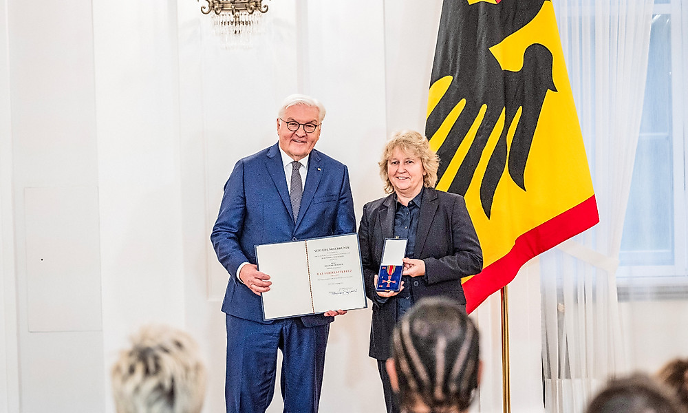Birgit Bauer-Schick, Bereichsleiterin Frauen- und Mädchenfußball des SC Freiburg, hat an diesem Mittwoch von Bundespräsident Frank-Walter Steinmeier das Bundesverdienstkreuz am Bande verliehen bekommen.