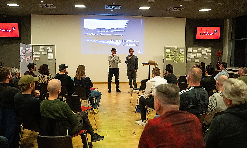 Rund 50 Mitglieder hatte der SC Freiburg eingeladen, um über die bereits feststehenden Umbaumaßnahmen des Dreisamstadions zu informieren und zugleich den Anwesenden die Möglichkeit zu geben, sich in bestimmten Bereichen in die Gestaltung einzubringen.