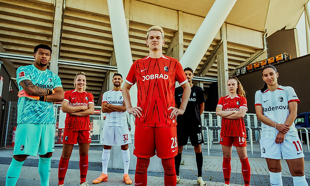 Auf der linken Brustseite der Trikots befindet sich unser SC-Wappen, rechts der eingestickte Nike-Swoosh. Bei den Männern ziert der Schiftzug von Hauptsponsor JobRad die Brust, auf dem Ärmel ist Exklusivpartner Lexware präsent. Bei unseren SC-Frauen wirbt auf der Vorderseite Hauptsponsor badenova, auf dem Ärmel ist JobRad präsent.