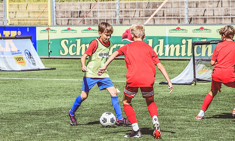 Foto: SC Freiburg; Bildunterschrift: Bei den Kleinsten wichtig: Dribbeln und Ballerobern im Eins-gegen-Eins