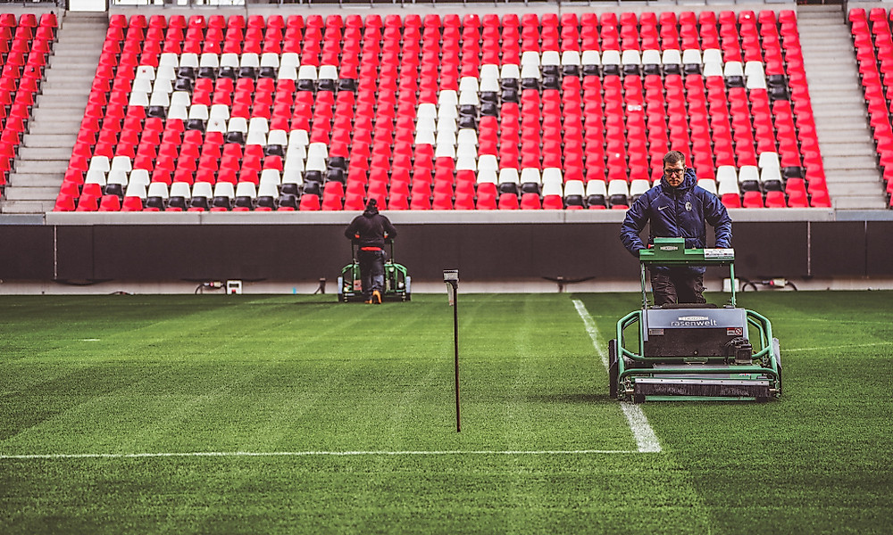 Mittlerweile ist es November. Der neue Rasen ist den Witterungsverhältnissen entsprechend gut angewachsen. Aber er möchte gepflegt werden. Immer. Jeden Tag. „Der Rasen macht nie Wochenende. Wir passen uns dem Rasen an und sind immer da, wenn er etwas braucht“, sagt Haeber.
