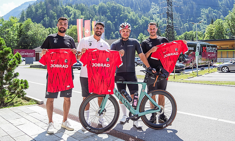 1.000 Menschen täglich neu aufs Rad zu bringen, ist für JobRad Routine. Hunderte Kilometer ohne E-Antrieb auf dem Rad zurückzulegen, um Trikots auszuliefern – das ist auch für JobRad nicht alltäglich, für einen Social-Media-Redakteur von JobRad aber auch kein größeres Problem. Mehr als 250 Kilometer radelte er am Donnerstag von Freiburg nach Schruns (Österreich), um das Trikot nachmittags den Spielern des Sport-Club zu übergeben.