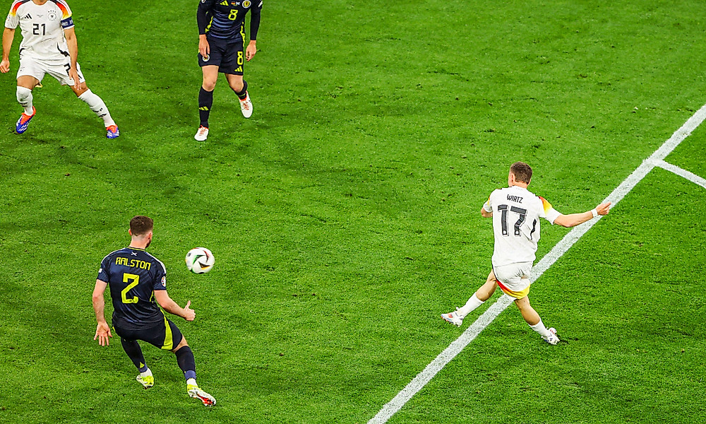 Wiedensohler: Genau. Die Schotten standen massiert vor dem eigenen Tor, einlaufende deutsche Spieler hatten auch noch zusätzliche Gegner aus dem Rückraum tief mitgezogen. Statt direkt vor das Tor spielte Joshua Kimmich nun flach parallel zur Sechzehnerlinie nach innen, wo Wirtz von der Sechzehnerkante direkt und flach abschloss. Statt des Vollspanns nahm er dabei den Innenspann, der Kontrolle und Zielgenauigkeit begünstigt und aus 16 bis 20 Metern auch allemal genügend Schärfe ermöglicht – erst recht mit den heute technologisch optimierten Bällen.