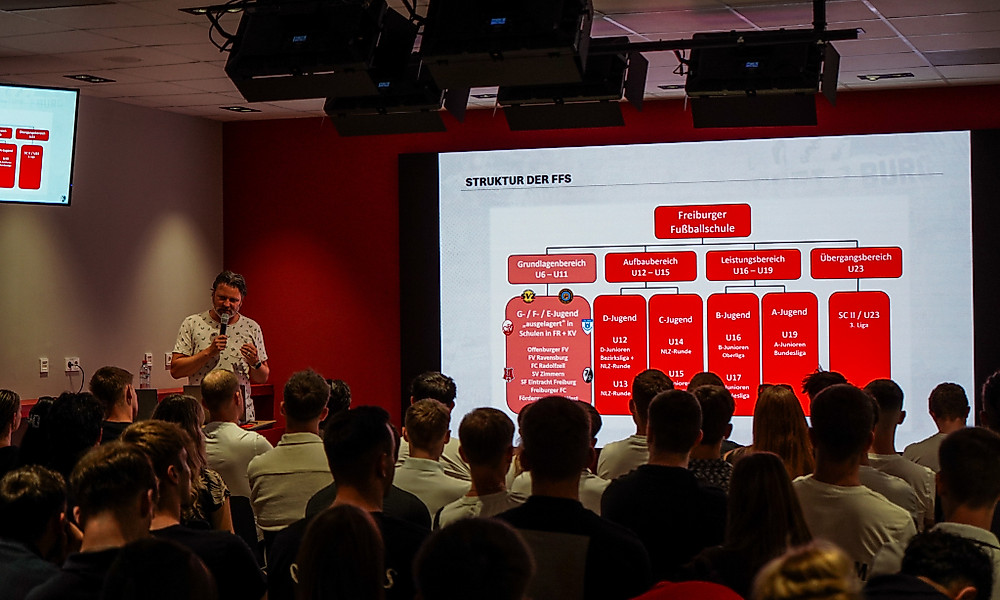 Zur gleichen Zeit fanden zwei Vorträge im Pressekonferenzraum des Stadions statt. Markus Kiefer, Pädagogischer Leiter der Freiburger Fußballschule, präsentierte das Konzept der Fußballschule, stellte Kooperationsvereine vor und erzählte, wie viele aktuelle SC-Spieler den Weg über die Fußballschule zu den Profis geschafft haben: Zehn Spieler und sieben Trainer und Betreuer. „Wenn man die Einsatzminuten von selbst ausgebildeten Spielern der Saison 2024/25 in der Bundesliga betrachtet, steht der SC ligaweit auf Platz eins.“ Eine stolze Tatsache.
