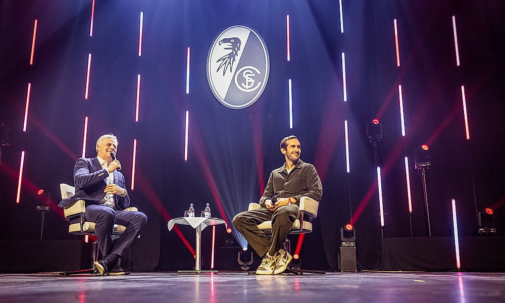 Beim jährlichen Neujahrsempfang des Sport-Club unterhielt sich Moderator Tom Bartels mit SC-Trainer Julian Schuster vor rund 500 Gästen im Europa-Park über dessen Werdegang, große Fußstapfen und sein erstes halbes Jahr als Bundesligatrainer.