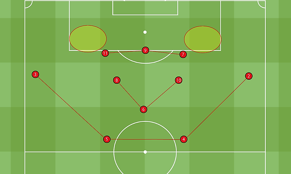 Wiedensohler: Besser nicht. Zumindest sollte man das nicht zu früh tun. Für die letzten circa zehn Minuten wäre stattdessen etwa eine Struktur mit drei Stürmern denkbar. Die äußeren, im Bild die 11 und 7, müssen kopfballstark sein, der zentrale Neuner eher ein Abschlussspieler. Die Außenverteidiger und Achter rücken vor, um zweite Bälle zu erobern, erneut die Box zu füttern oder selbst torgefährlich nachzustoßen. In dieser sicher risikobereiten Staffelung bilden somit drei Spieler eine immerhin noch relativ stabile Restverteidigung. Sie haben zudem die Aufgabe – womöglich nach zwei, drei vorbereitenden Flachpässen – immer wieder gute Diagonalbälle in die Zielflächen zu spielen. So hast du eine gute Struktur, um viele Aktionen in und an der Box herbeizuführen, Freistöße und Eckbälle zu bekommen und dem Gegner eine wilde, stressige Schlussphase zu bereiten.
