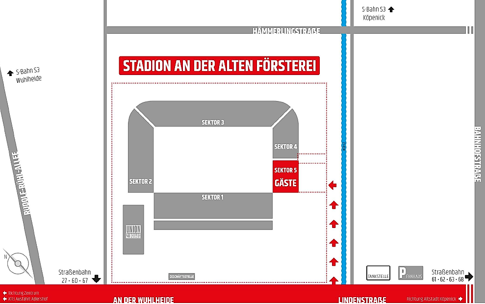 - Behindertenstellplätze stehen in begrenzter Anzahl am Gästeparkplatz zur Verfügung und müssen im Vorfeld unter handicap@fc-union-berlin.de beantragt werden.
