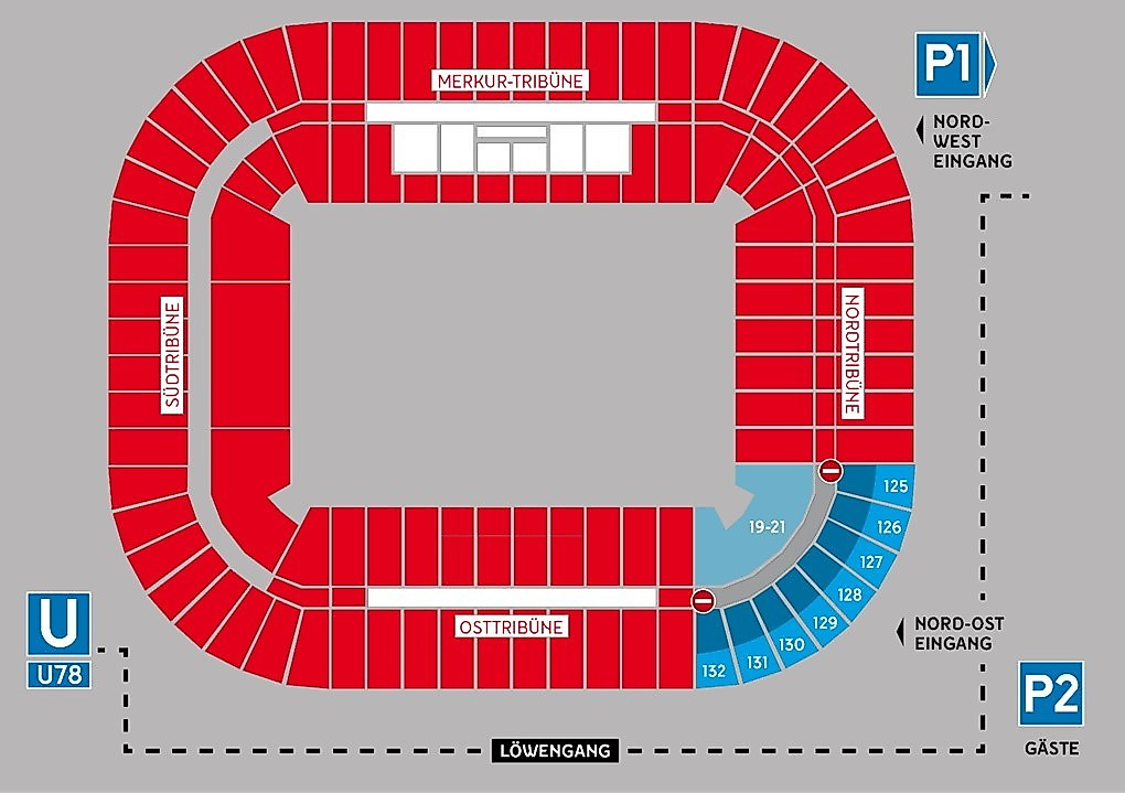 - Der Gästebereich erstreckt sich auf die Blöcke 19-21 (Stehbereich) und die Sitzplatz in den Blöcken 125-132.