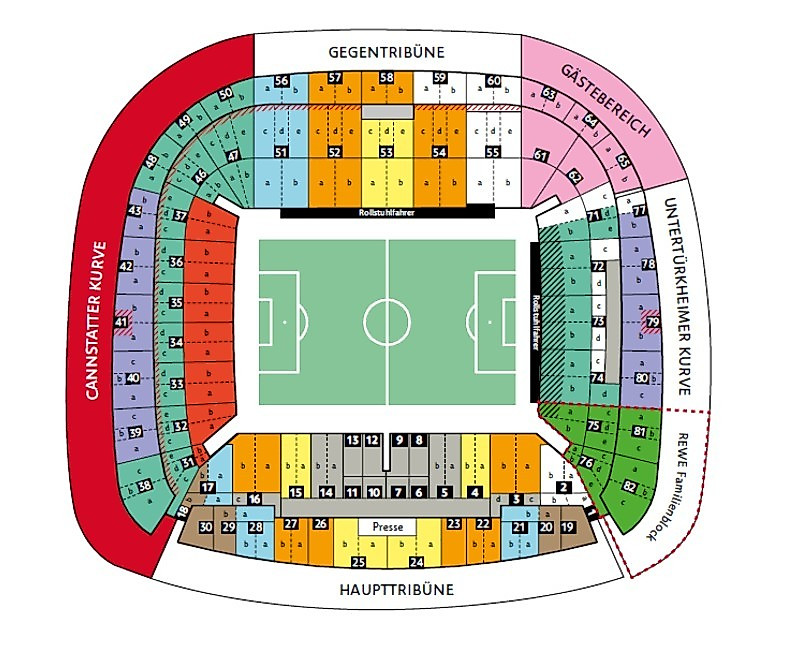 - Der Gästebereich befindet sich in den Blöcken 61, 62, 63, 64 und 65 in der Untertürkheimer Kurve sowie in den Blöcken 55, 59 und 60 auf der Gegentribüne.