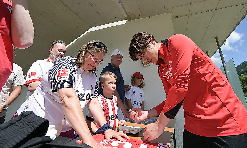 Zwei Jahre, drei Monate und 13 Tage später steht Katja im Höler-Trikot neben der Tribüne in Schruns und sammelt Autogramme. Zweieinhalb Tage dauerte die Reise von Norwegen nach Österreich. Jetzt genießt die Lehrerin für Deutsch und Englisch die ungewohnte Nähe zu ihrer Herzensmannschaft. „Ich komme ursprünglich aus dem Badischen und bin vor 32 Jahren ausgewandert“, erzählt Katja. „Dort ist trotz der großen Distanz die Liebe zum SC immer größer geworden.“ Ihre Familie teilt die Zuneigung. Ehemann Haino hat sich mit den Kindern Nico und Jana mit ins Getümmel gestürzt. Der 7-jährige Sohnemann trägt dabei schon das neue SC-Trikot und lässt sich das Vorgängermodell von der gesamten Mannschaft signieren. Zuhause in Norwegen soll es gerahmt werden und einen Ehrenplatz im Kinderzimmer erhalten.
