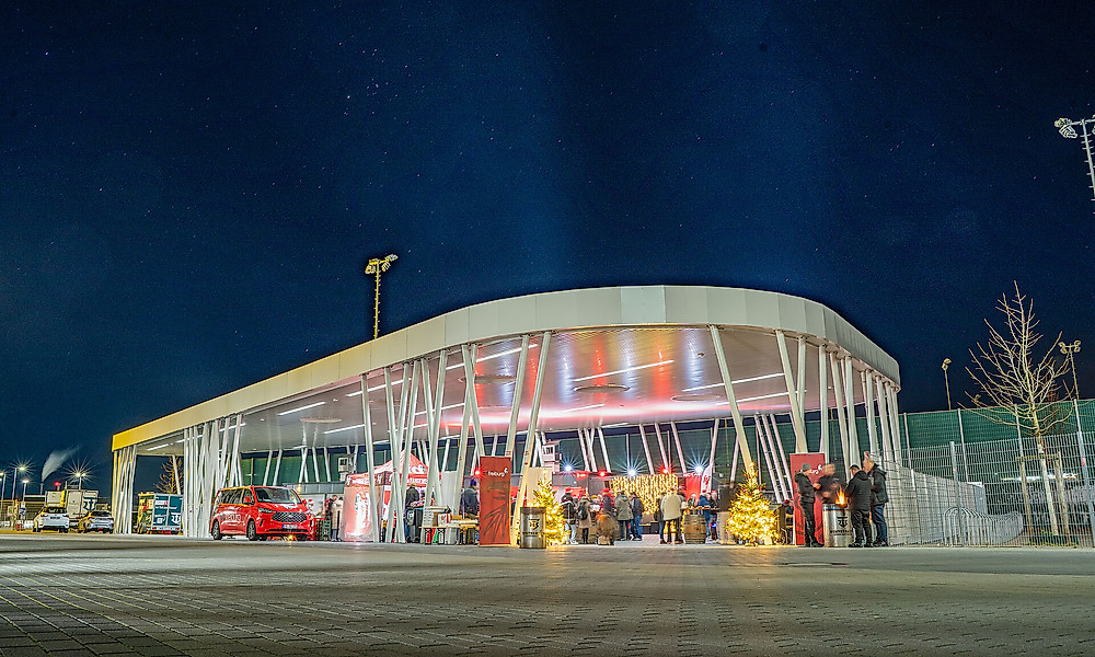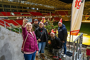 Die festliche Dekoration mit Weihnachtsbäumen, Nikolausmützen und stimmungsvoller Beleuchtung trug zum besonderen Rahmen des Abends bei. Ein kurzer Besuch auf der leeren Südtribüne bot zudem die Möglichkeit für Erinnerungsfotos.