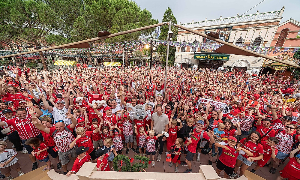 Mehr strahlende Gesichter in SC-Trikots gibt es wohl nur bei einem Heimsieg gegen den FC Bayern zu sehen: Beim fünften SC Freiburg Fantag zu dem der Europa-Park jüngst tausende Mitglieder und Dauerkarteninhaber des Sport-Club eingeladen hatte, kannte die Begeisterung keine Grenzen. „Es ist fantastisch, hier im Europa-Park gemeinsam mit den Fans so einen besonderen Tag zu erleben“, fand SC-Cheftrainer Julian Schuster, der der Einladung gemeinsam mit den SC-Anhängern gerne gefolgt war. Wie hoch der Freizeitpark auch bei Spielerinnen und Spielern des SC im Kurs steht, belegt nun eine regelrechte Video-Liebeserklärung, mit der SC-Protagonisten wie Hasret Kayikçi, Lucas Höler oder Kapitän Christian Günter dem Familienunternehmen in sehr persönlichen Statements im Namen des SC Freiburg zum Geburtstag gratulieren.