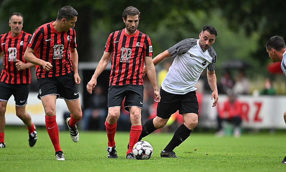 Gut 400 Zuschauer trotzten am Sportplatz Läger dem Nieselregen - die Ü40 des heimischen FCW und die Traditionsmannschaft des SCF dankten es ihnen mit einem flotten Spiel. Für die Tore sorgten dabei die Ex-Profis. Der Endinger Volker Hügel, für den die Anreise nach Weisweil nur ein Katzensprung war, zeigte sich in seiner Nachbarschaft von Beginn an hellwach und erzielte in den Anfangsminuten die ersten beiden Treffer. Niels Hansen und zweimal Karim Matmour legten bis zur Pause für den Sport-Club nach.