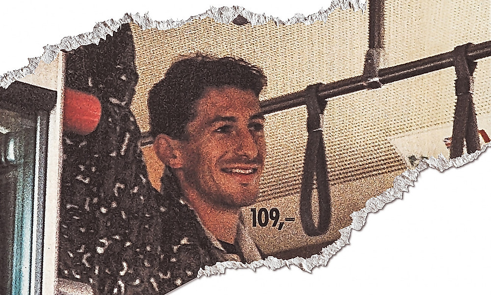 Das ist doch aus dem Breuninger-Prospekt! An die Werbeaktion erinnere ich mich noch total gut. Das Modehaus wollte nach dem Aufstieg 1993 eine Partnerschaft mit dem Sport-Club eingehen, und als die erste Werbekampagne entwickelt wurde, war auch der Mannschaftsrat eingebunden. So entstand dann die Idee, uns Spieler in Situationen abzulichten, die auch unserem Alltag entsprachen. Bei mir lag es also sehr nahe, mich mit