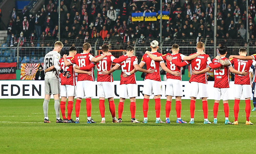 Um ein Signal für einen sofortigen Waffenstillstand auszusenden, räumt der SC Freiburg vor, während und nach dem Heimspiel gegen den VfL Wolfsburg zudem Zeiten auf seinen LED-Banden und Screens frei, um eine Botschaft für den Frieden in der Ukraine zu senden.