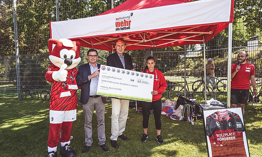 „Auf dem Bolzplatz macht das Fußballspielen wieder richtig Spaß. Das wäre ohne die großzügige Hilfe des SC Freiburg sowie den beiden SC-Sponsoren Schwarzwaldmilch und Rose Bikes nicht möglich gewesen“, dankt Baubürgermeister Martin Haag den Kooperationspartnern bei der symbolischen Scheckübergabe an die Stadt.