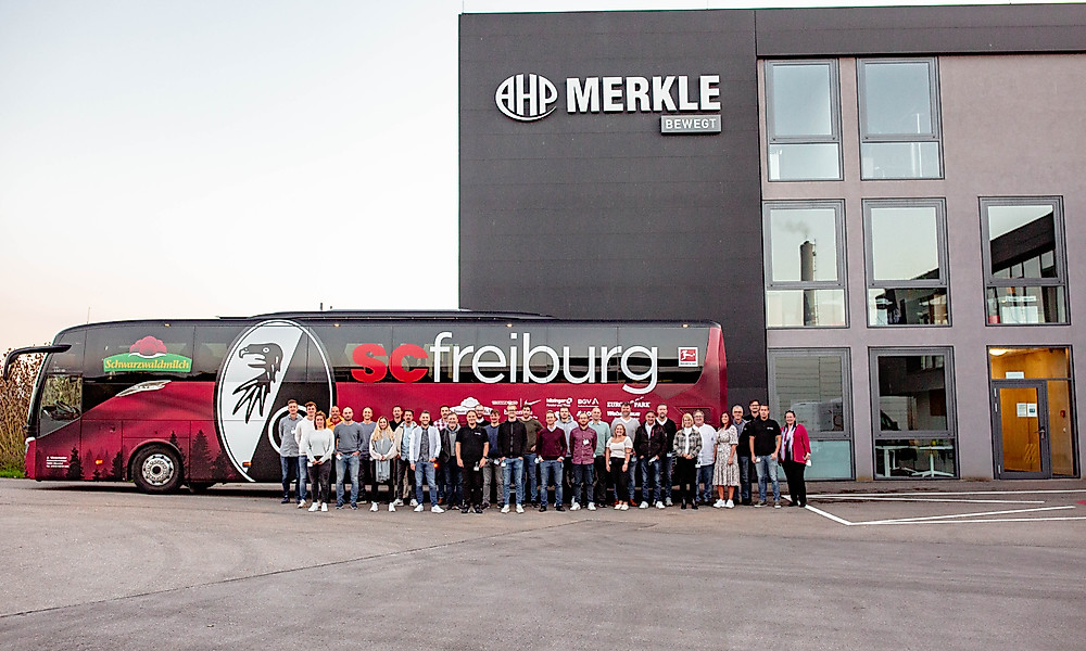 Eine Delegation des SC Freiburg, bestehend aus Mitarbeitern der Fußballschule, der SC-Marketing-Abteilung und des Vermarktungspartners Infront haben AHP Merkle, dem Hauptsponsor der Freiburger Fußballschule und inhabergeführten Maschinenbauunternehmen aus dem südbadischen Gottenheim, einen Besuch abgestattet.