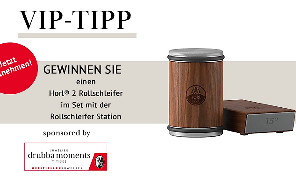 Gewinnen Sie zu diesem Heimspiel einen Horl® 2 Rollschleifer im Set mit der Rollschleifer Station aus Nussbaum Massivholz. Erleben Sie dank Pressmontage und den verbauten Kugellagern ein völlig neues, spielfreies Rollgefühl. Die einfache Handhabung des Schleifers garantiert geschärfte Messer wie vom Profi. Mit der passenden Rollschleifer Station ist der Rollschleifer gut verstaut und dennoch immer griffbereit.