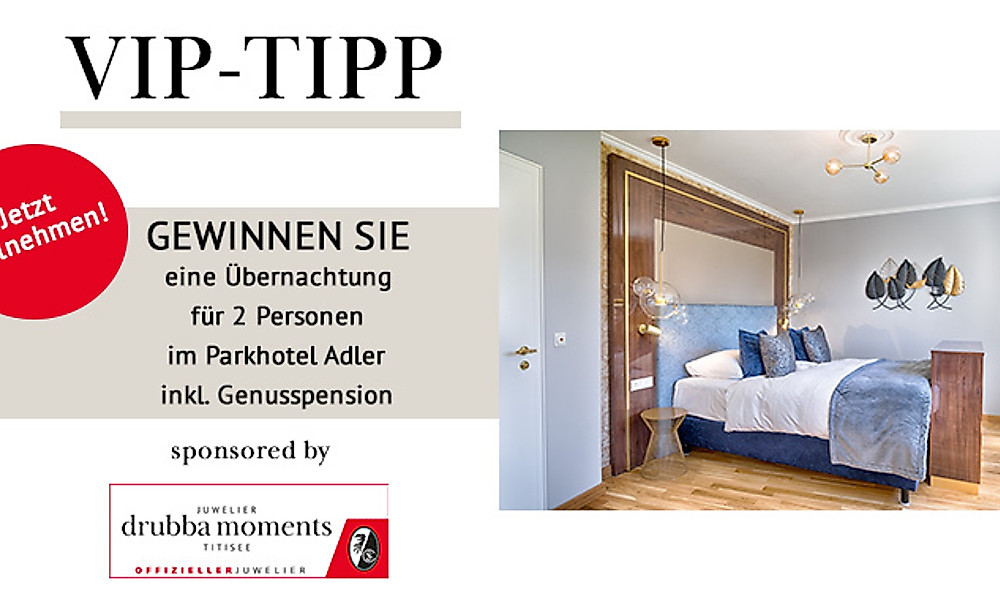 Gewinnen Sie zum heutigen Heimspiel einen Gutschein für eine Übernachtung im Parkhotel Adler in Hinterzarten für zwei Personen inklusive Genusspension. Freuen Sie sich auf kulinarische Genüsse bereits am Frühstücksbuffet und lassen Sie den Abend mit einem köstlichen 4-Gänge-Menü ausklingen. Lassen Sie die Seele im großzügig gestalteten Wellnessbereich mit In- und Outdoor Pools und einem lichtdurchfluteten Saunabereich baumeln oder powern Sie sich im modernen Fitnessraum aus. Im Herzen des Schwarzwaldes, in einem eigenen Hotelpark gelegen, bietet das Parkhotel Adler die perfekten Voraussetzungen für einen Tag Kurzurlaub.