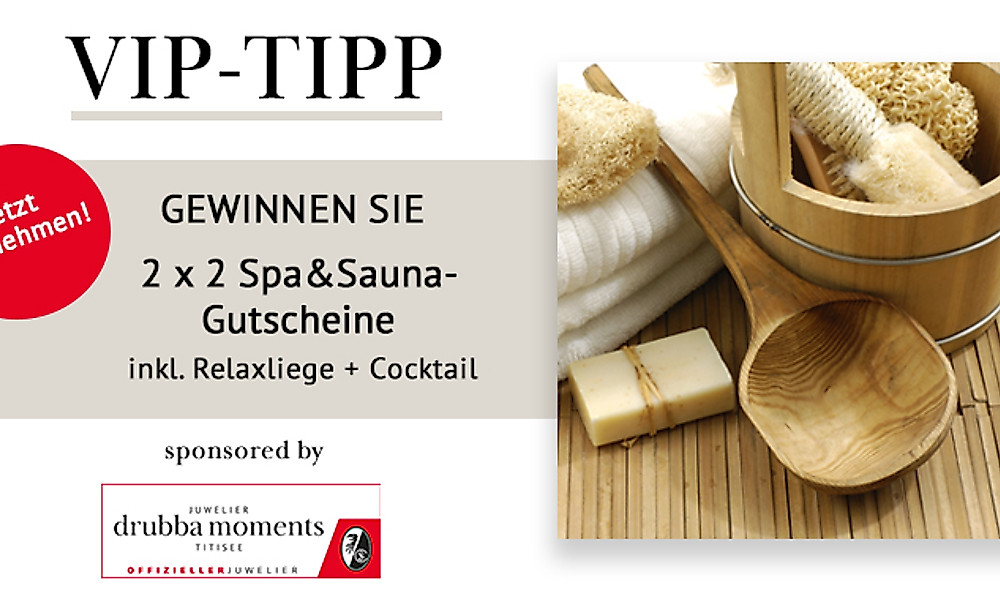 Gewinnen Sie beim heutigen VIP-Tipp 2 x 2 Tageskarten zu einer textilfreien Spa- und Saunawelt, inklusive Relaxliege für zwei Personen sowie erfrischende Cocktails. Erleben Sie Wellness auf höchstem Niveau und spüren Sie Erholung in einer Vielzahl an liebevoll thematisierten Saunen. Wohltuende Pools wecken die Vitalität, während fruchtige Cocktails Erfrischung für Zwischendurch garantieren. Ein Rundum-Wohlfühl-Erlebnis, um neue Energie zu tanken.