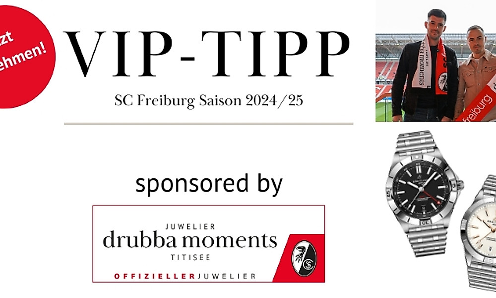 Im VIP-TIPP zur Saison 2024/25 haben Sie mit Juwelier Drubba Moments die Chance auf eine Breitling Chronomat Automatic GMT 40 für den Herren oder eine Breitling Chronomat Automatic 36 für die Dame. Der Gewinner oder die Gewinnerin der Uhr wird nach dem letzten Heimspiel der Saison ermittelt und hat die Wahl zwischen der Damen- und der Herrenvariante.