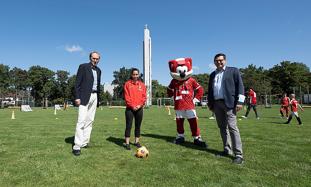 Foto (v.l.n.r., Patrick Seeger/Stadt Freiburg): Martin Haag (Baubürgermeister Stadt Freiburg), Hasret Kayikci (Bundesligaspielerin SC Freiburg), SC-Maskottchen "Füchsle", Oliver Leki (Vorstand SC Freiburg)