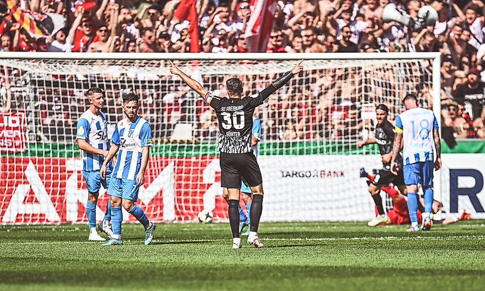 Christian Günter was subbed on and did exactly what he did against VfL Wolfsburg last season: He came on and with his first touch of the ball, he fired his team ahead. 1-0 SC in the 60th minute. A thunderbolt. “I love to shoot from those positions and sometimes one goes in,” Günter said of his goal. Vincenzo Grifo, Eggestein and Ritsu Doan had the next big chances, with SC now clearly the better team. The attacks came constantly from the left and right of the Oberachern goal. The fifth-division side had begun to tire after their efforts in the first half.