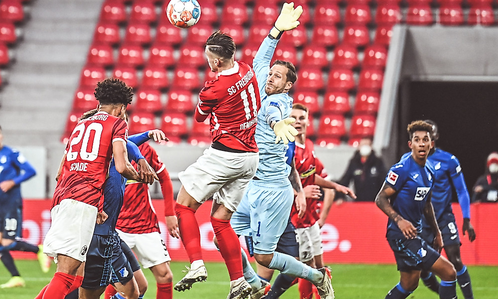 Streich shook things up at half-time as he sent Manuel Gulde onto the pitch in place of Ermedin Demirovic. Freiburg switched to a back three as they put Hoffenheim under constant early pressure. Dangerous attacks were tough to come by, however, as the visiting side continued to defend resolutely. Flekken also had very little to do at the other end. Raum had a go from a Hoffenheim free-kick but couldn't find the target. Grifo then had the golden opportunity to put the hosts in front. Akpoguma fouled Günter, who was charging into the Hoffenheim box, and the referee pointed to the spot (62’). Grifo took the kick, but Baumann guessed right and managed to keep the ball from hitting the back of the net. Schade missed on the follow-up.
