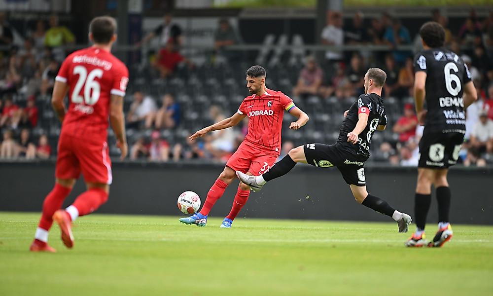 Les entraîneurs s'étaient mis d'accord sur un temps de jeu de deux fois 50 minutes et les deux équipes ont entamé la rencontre sur un bon rythme. Ce sont les hôtes qui ont eu les meilleures occasions. Après une contre-attaque, Lukas Fridrikas s'est retrouvé seul dans les seize mètres et Noah Atubolu a détourné le tir au premier poteau en corner (12e). Le SC a eu sa première occasion dans la foulée mais Merlin Röhl n’a pas mis assez de puissance dans sa tête après un coup franc de Grifo. De l'autre côté, Atubolu a dû s'employer après un tir de Lukas Fadinger (18e).