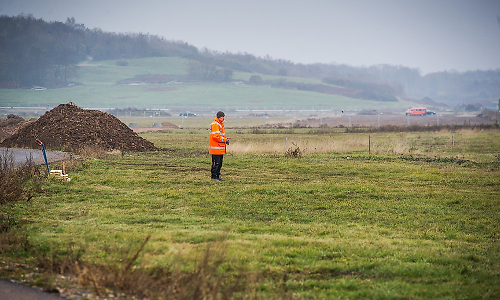 Mit schwerem Gerät wird zuerst die oberste Grasschicht abgetragen, dann die darunterliegende. So tasten sich die Bauarbeiter sukzessive voran, bis noch vor dem Jahreswechsel eine immer tiefergehende Grube entsteht.
