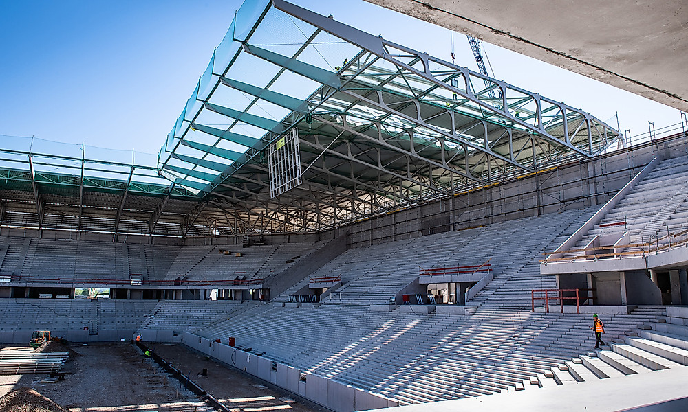 Die Dacharbeiten schreiten flott voran. Auf der Osttribüne wird die erste lichtdurchlässige Dacheindeckung montiert, auf der Südtribüne werden erste Wellenbrecher befestigt und die Unterkonstruktion für die spätere Videowall aufgehängt. In den Kiosken werden Fliesenarbeiten durchgeführt. Aufgrund dieses Baufortschritts muss eine der beiden Baustellen-Cams umziehen. Statt der Draufsicht gibt’s deshalb ab sofort den Blick von der Tribüne aus aufs Spielfeld – und der ist nicht minder schön. Neugierig? Hier gelangen Sie direkt zur Kamera.