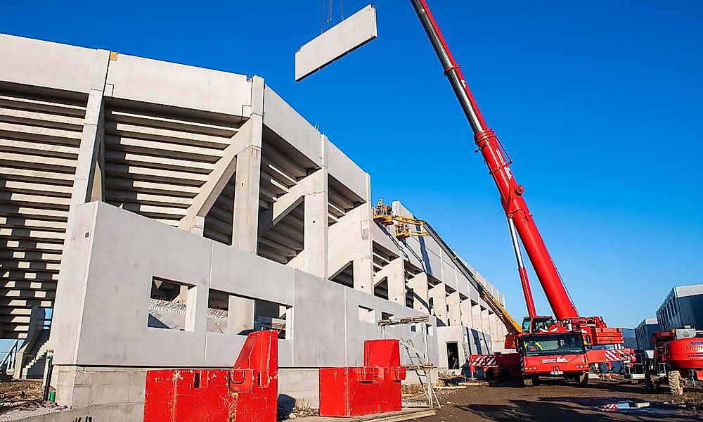 Der bisher milde Winter treibt den Stadionneubau voran. Sowohl im Süden als auch im Osten werden weitere Dachträger angebracht. Die ersten Kioske stehen dort ebenfalls bereits. Parallel dazu werden im Außenbereich am Parkplatz P2 die Randsteine gesetzt. Für die Grünflächen auf dem Parkplatz P4 wird der Oberboden eingebaut und im Greenkeeper-Haus die Rohrleitung gelegt.