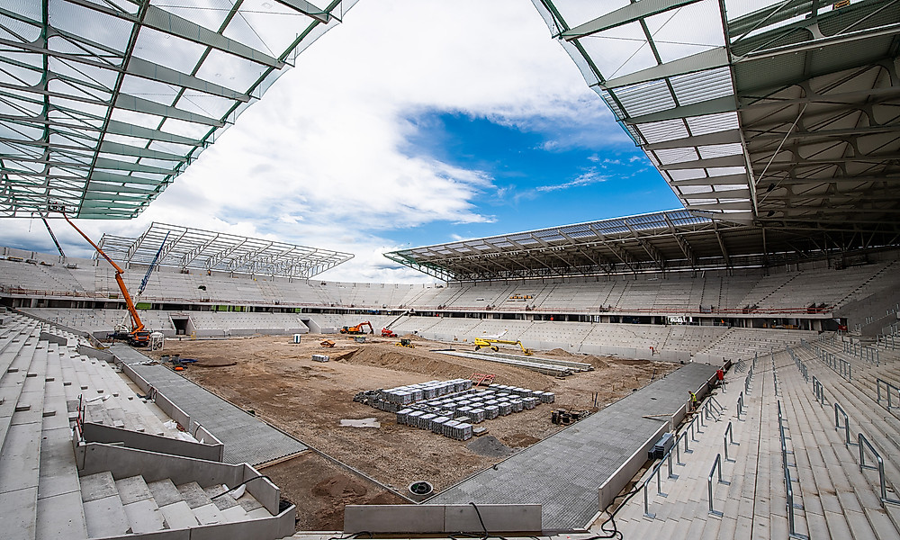 Während die Profis des SC Freiburg im Juni die Saison zu Ende spielen, wird im Nordwesten fleißig an der künftigen Spielstätte gewerkelt. Im Stadioninnenraum wird der Boden angepasst, damit schon bald die Arbeiten für den Rasen beginnen können. Im Außenbereich schreitet die Bepflasterung des Boulevards gut voran.