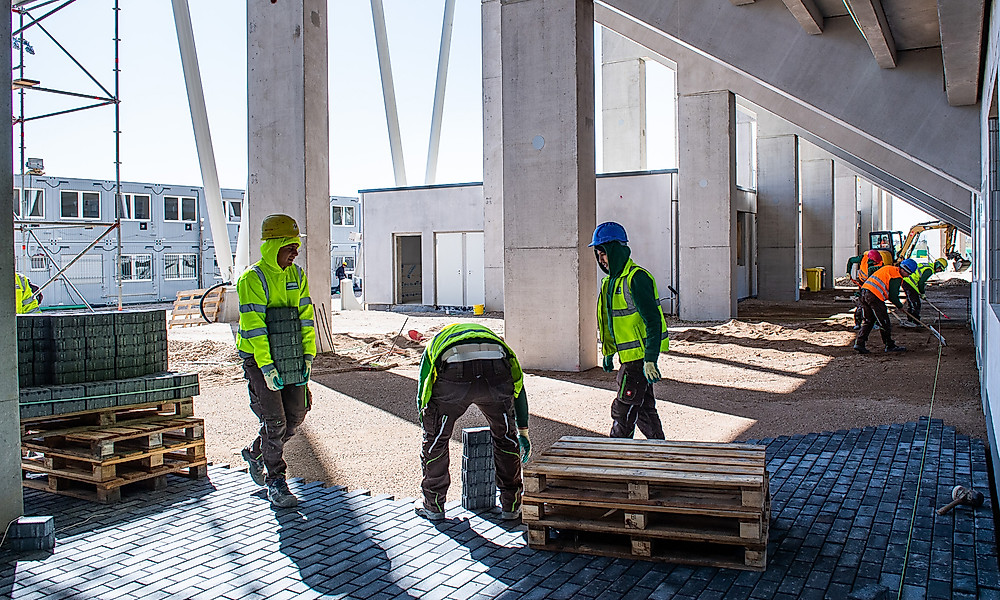 An den Kiosken werden die ersten Rollläden ein-, die umliegenden Sanitäranlangen weiter ausgebaut, die Promenade im Stadionumlauf wird gepflastert. Über dem künftigen Verwaltungsgebäude im Westen wird das Dach montiert, und auch die Tribüne zwischen Ost- und Südseite wird geschlossen. Zudem bekommt das Hauptgebäude Fenster eingesetzt.