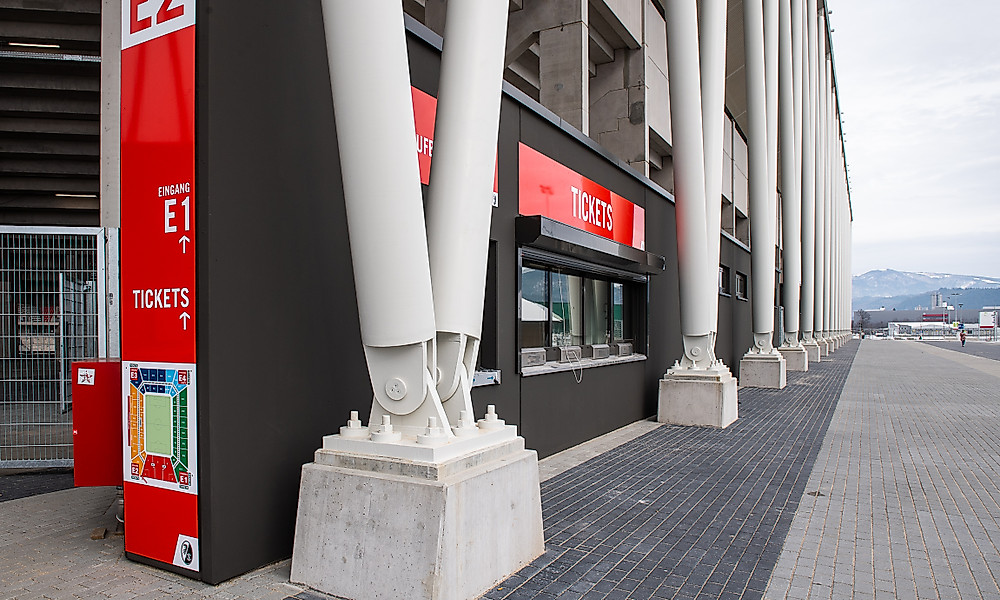 Zum Ausklang des Winters erhält die künftige Spielstätte des Sport-Club einige weitere Farbtupfer: Sowohl auf der Promenade als auch im Innenbereich werden Beschilderungen angebracht, die den Fußballfans in der neuen Umgebung die nötige Orientierung geben sollen.