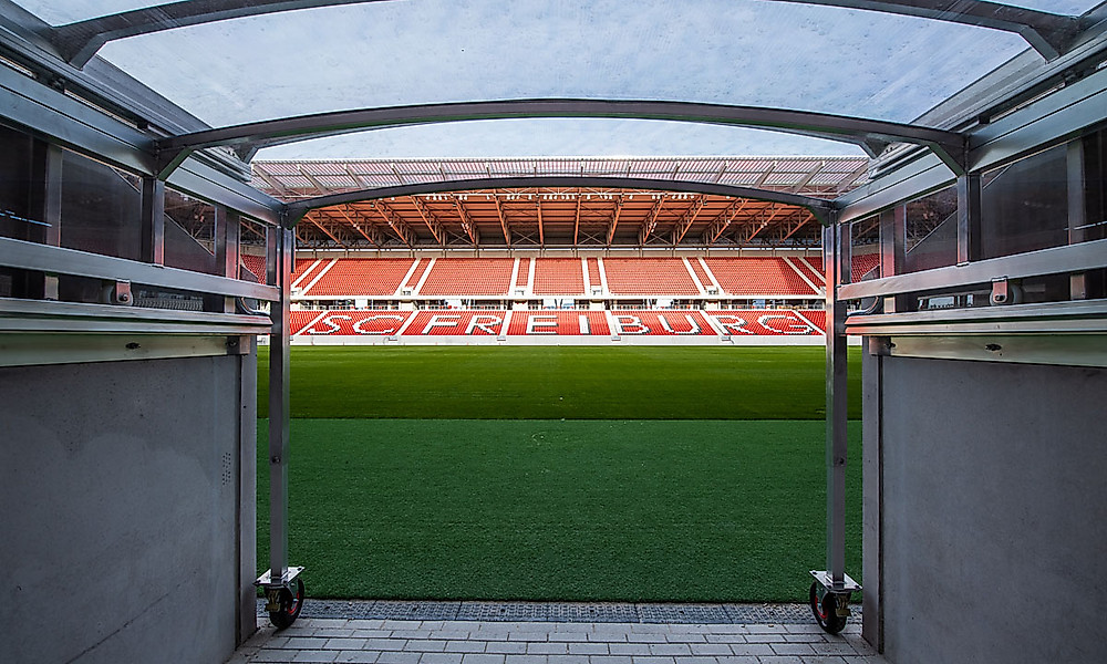 Auf der Tribüne werden im Nordwesten Freiburgs im März die Glasgeländer fest verankert, im Innenraum wird der ausfahrbare Spielertunnel montiert.